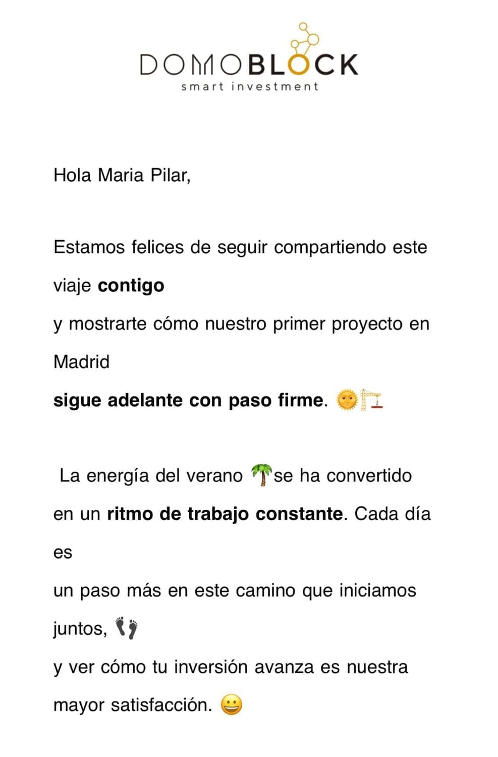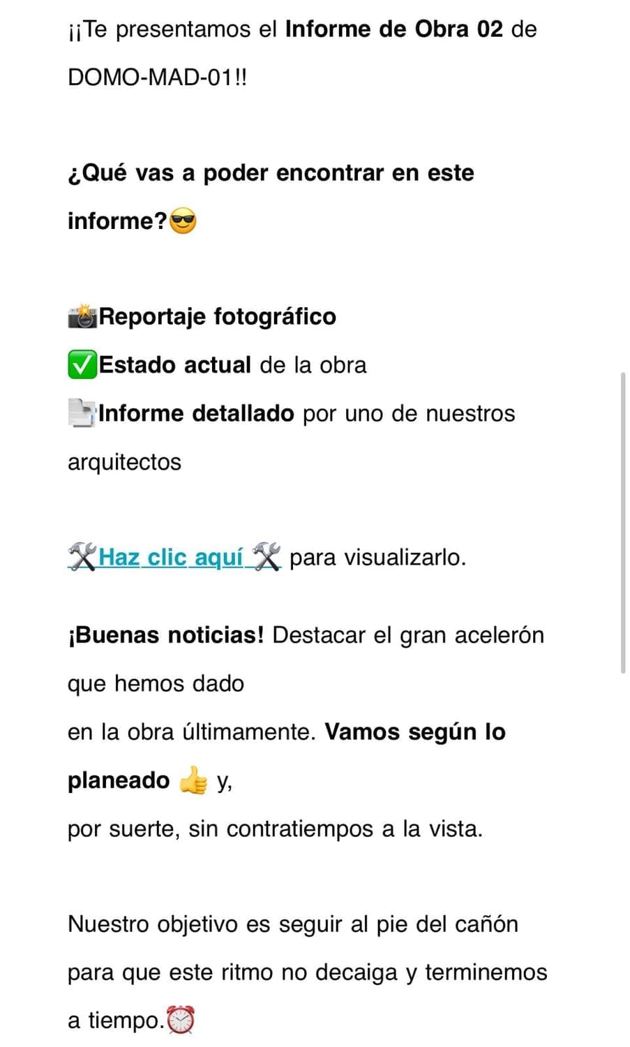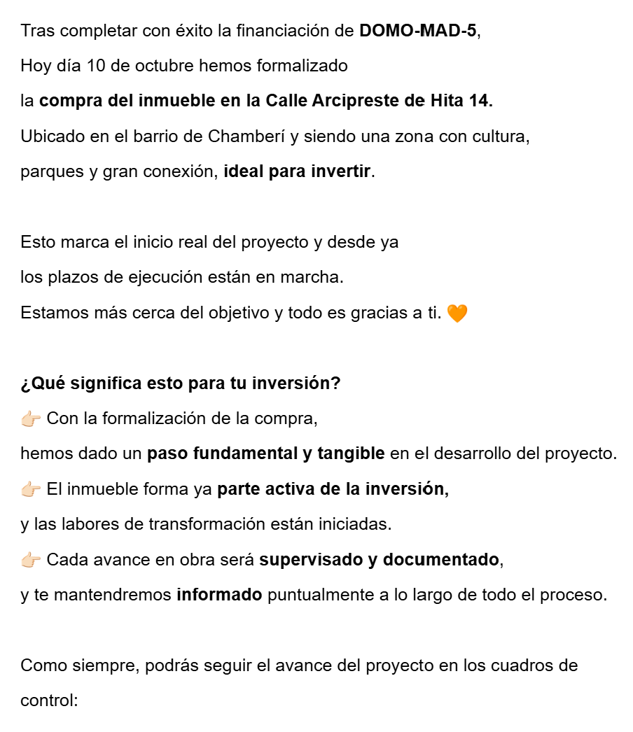 Lo que más me ha llamado la atención es la transparencia total y la calidad de la información que recibimos como inversores. Cada cierto tiempo nos llega un correo con un informe muy detallado, que incluye fotos actualizadas de la obra, el estado real de los trabajos y un informe técnico elaborado por el arquitecto encargado.