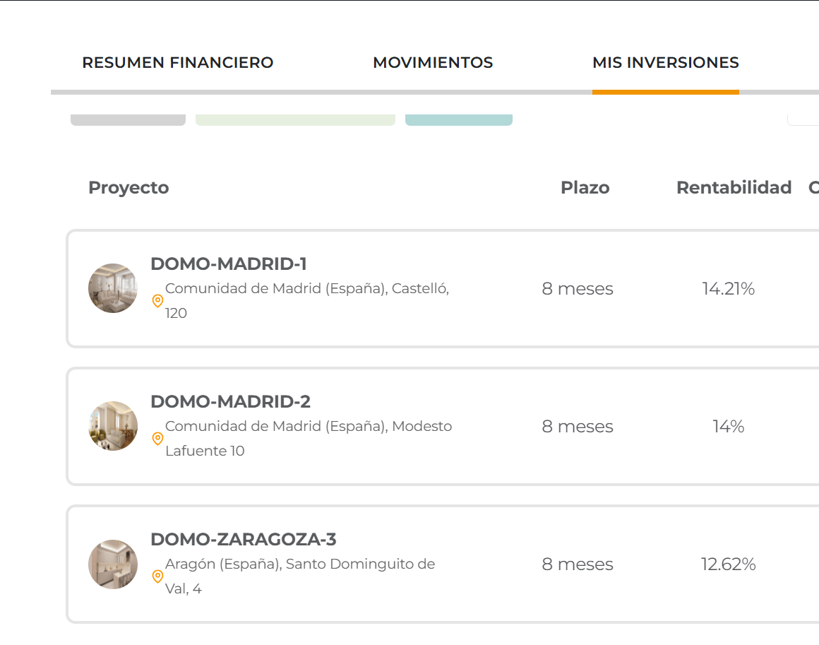 No es el único proyecto en el que he invertido con Domoblock. Más abajo te muestro mi dashboard.