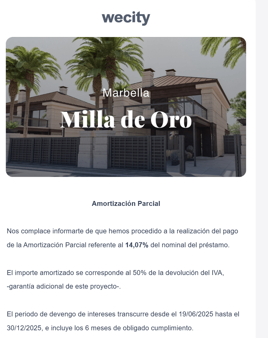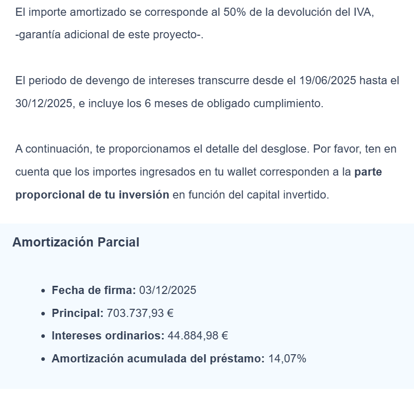 Ahora verás otro proyecto que ya me han ido devolviendo parcialmente, me escribieron diciendo que habían procedido a la realización del pago de la Amortización Parcial referente al 14,07% del nominal del préstamo.